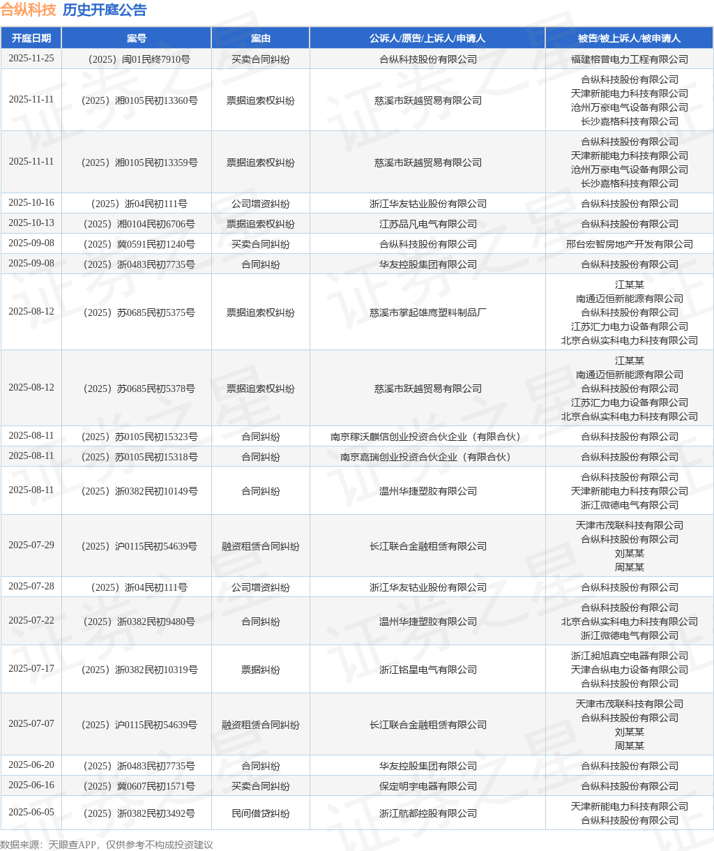 案号:(2025)闽01民终7910号根据统计,近一年内以合纵科技股份有限公司为当事人的历史开庭公告有27则,其中案由为“买卖合同纠纷”的公告以8则居首,其次为“合同纠纷”有6则,“票据追索权纠纷”有5则。历史开庭公告(前20条)如下:
