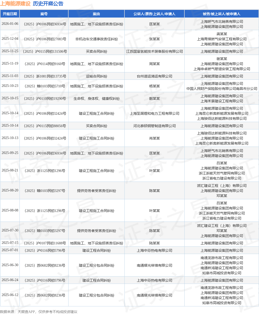 案号:(2025)沪0115民初131506号根据统计,近一年内以上海能源建设集团有限公司为当事人的历史开庭公告有42则,其中案由为“建设工程施工合同纠纷”的公告以9则居首,其次为“买卖合同纠纷”有6则,“地面施工、地下设施损害责任纠纷”有6则。历史开庭公告(前20条)如下: