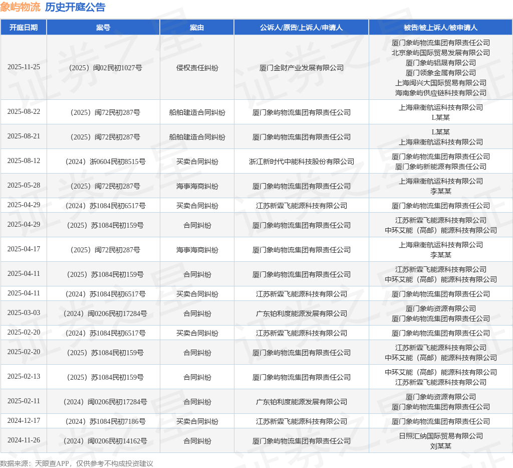 案号:(2025)闽02民初1027号根据统计,近一年内以厦门象屿物流集团有限责任公司为当事人的历史开庭公告有17则,其中案由为“合同纠纷”的公告以7则居首,其次为“买卖合同纠纷”有5则,“海事海商纠纷”有2则。历史开庭公告如下: