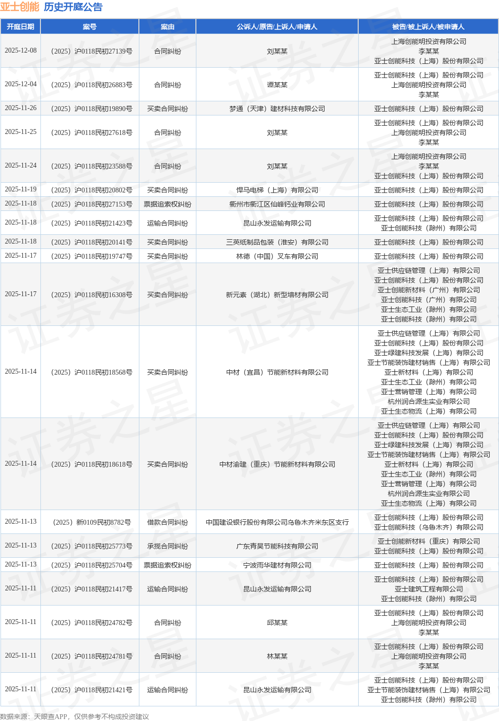 案号:(2025)沪0118民初27618号根据统计,近一年内以亚士创能科技(上海)股份有限公司为当事人的历史开庭公告有132则,其中案由为“买卖合同纠纷”的公告以37则居首,其次为“合同纠纷”有23则,“运输合同纠纷”有23则。历史开庭公告(前20条)如下:
