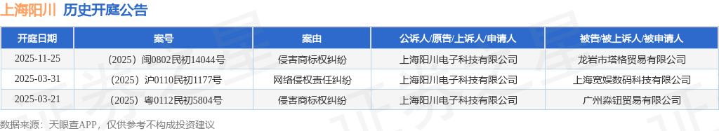 根据统计,近一年内以上海阳川电子科技有限公司为当事人的历史开庭公告有3则,其中案由为“侵害商标权纠纷”的公告以2则居首,其次为“网络侵权责任纠纷”有1则。历史开庭公告如下: