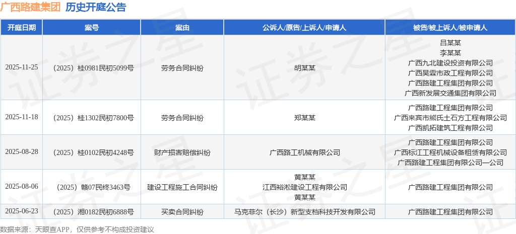 案号:(2025)桂0981民初5099号根据统计,近一年内以广西路建工程集团有限公司为当事人的历史开庭公告有5则,其中案由为“劳务合同纠纷”的公告以2则居首,其次为“买卖合同纠纷”有1则,“建设工程施工合同纠纷”有1则。历史开庭公告如下: