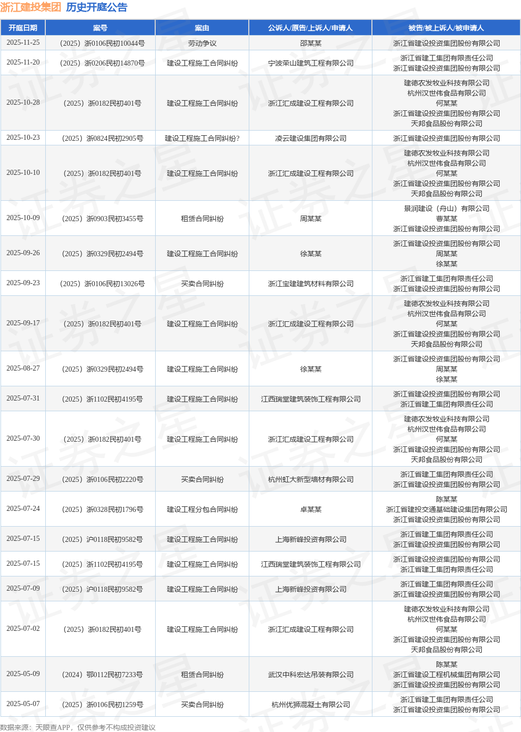 案号:(2025)浙0106民初10044号根据统计,近一年内以浙江省建设投资集团股份有限公司为当事人的历史开庭公告有38则,其中案由为“建设工程施工合同纠纷”的公告以12则居首,其次为“买卖合同纠纷”有9则,“租赁合同纠纷”有5则。历史开庭公告(前20条)如下: