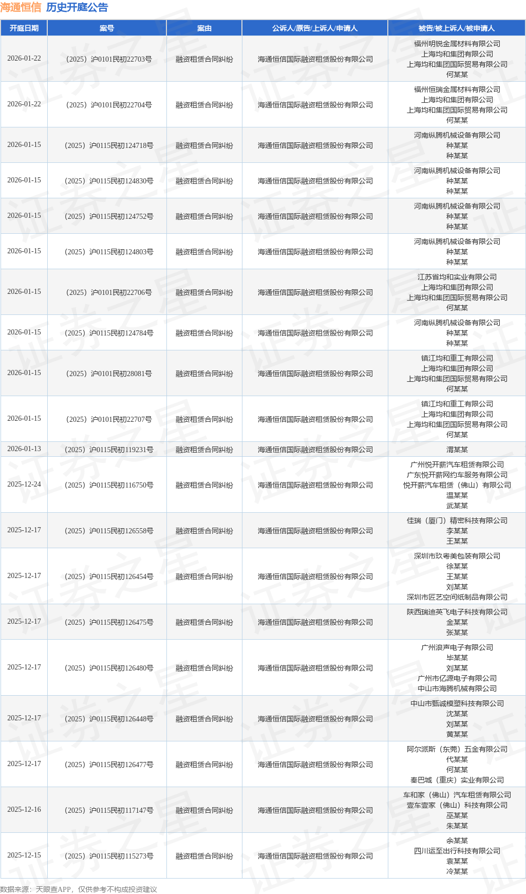 案号:(2025)沪0101民初29845号根据统计,近一年内以海通恒信国际融资租赁股份有限公司为当事人的历史开庭公告有1259则,其中案由为“融资租赁合同纠纷”的公告以1157则居首,其次为“申请实现担保物权”有28则,“合同纠纷”有18则。历史开庭公告(前20条)如下: