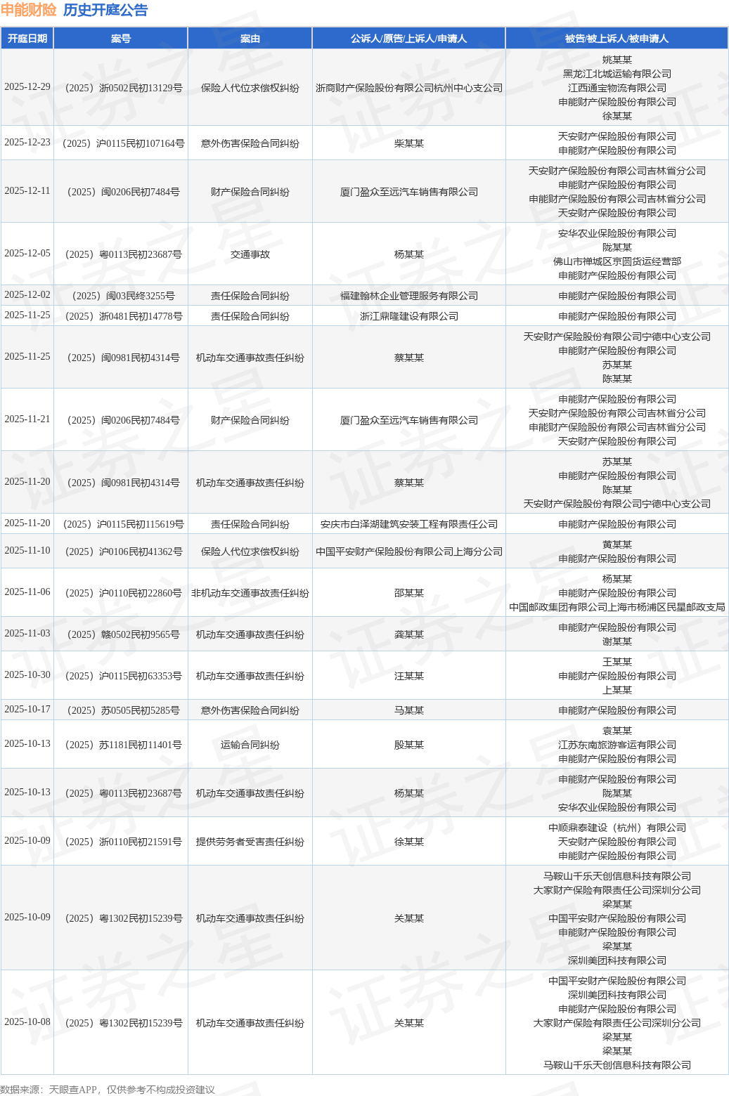 案号:(2025)闽0981民初4314号根据统计,近一年内以申能财产保险股份有限公司为当事人的历史开庭公告有71则,其中案由为“机动车交通事故责任纠纷”的公告以40则居首,其次为“责任保险合同纠纷”有8则,“财产保险合同纠纷”有5则。历史开庭公告(前20条)如下: