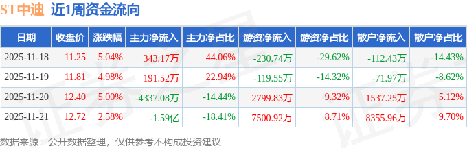 资金流向数据方面,本周ST中迪主力资金合计净流出1.97亿元,游资资金合计净流入9950.47万元,散户资金合计净流入9708.81万元。本周资金流向一览见下表: