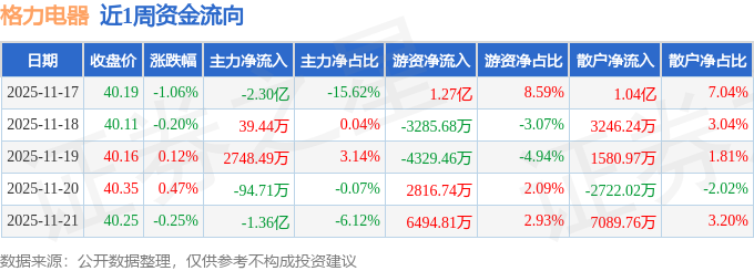 资金流向数据方面,本周格力电器主力资金合计净流出3.39亿元,游资资金合计净流入1.44亿元,散户资金合计净流入1.96亿元。本周资金流向一览见下表: