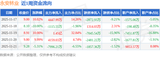 资金流向数据方面,本周永安林业主力资金合计净流入1.4亿元,游资资金合计净流出1.29亿元,散户资金合计净流出1049.65万元。本周资金流向一览见下表: