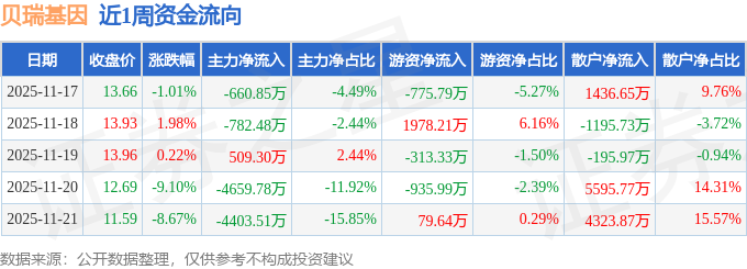 资金流向数据方面,本周贝瑞基因主力资金合计净流出9997.32万元,游资资金合计净流入32.74万元,散户资金合计净流入9964.58万元。本周资金流向一览见下表: