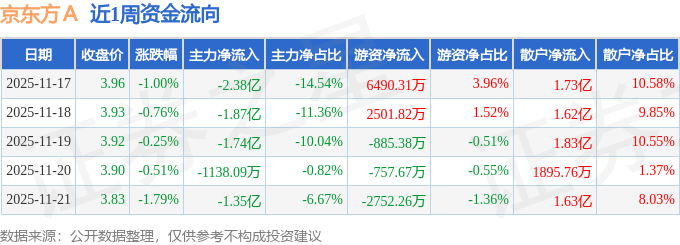 资金流向数据方面,本周京东方A主力资金合计净流出7.46亿元,游资资金合计净流入4596.83万元,散户资金合计净流入7.0亿元。本周资金流向一览见下表: