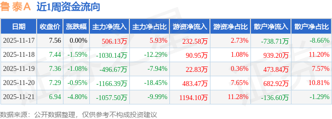 资金流向数据方面,本周鲁 泰A主力资金合计净流出3244.57万元,游资资金合计净流入2023.93万元,散户资金合计净流入1220.65万元。本周资金流向一览见下表: