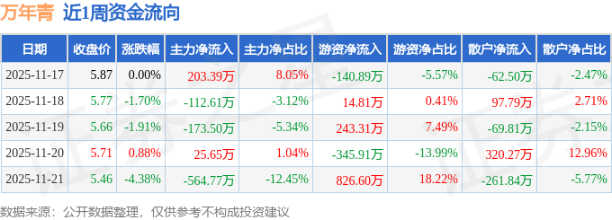 资金流向数据方面,本周万年青主力资金合计净流出621.83万元,游资资金合计净流入597.92万元,散户资金合计净流入23.91万元。本周资金流向一览见下表: