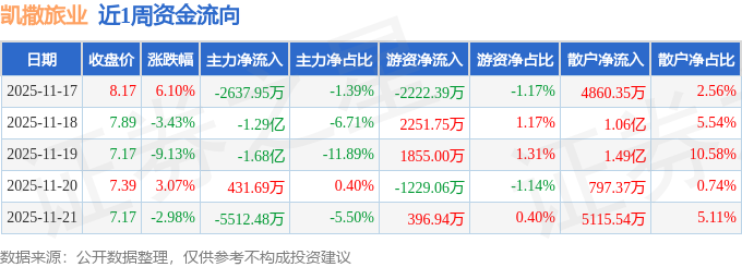 资金流向数据方面,本周凯撒旅业主力资金合计净流出3.74亿元,游资资金合计净流入1052.23万元,散户资金合计净流入3.64亿元。本周资金流向一览见下表: