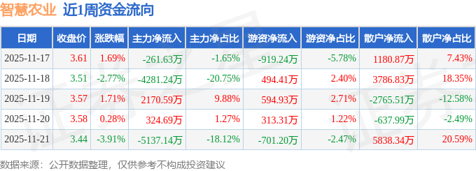 资金流向数据方面,本周智慧农业主力资金合计净流出7184.74万元,游资资金合计净流出217.8万元,散户资金合计净流入7402.53万元。本周资金流向一览见下表: