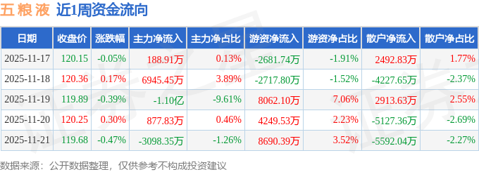 资金流向数据方面,本周五 粮 液主力资金合计净流出6061.9万元,游资资金合计净流入1.56亿元,散户资金合计净流出9540.58万元。本周资金流向一览见下表: