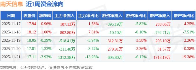 资金流向数据方面,本周南天信息主力资金合计净流出1232.34万元,游资资金合计净流出418.88万元,散户资金合计净流入1651.21万元。本周资金流向一览见下表: