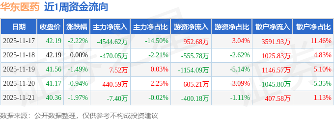 资金流向数据方面,本周华东医药主力资金合计净流出4573.96万元,游资资金合计净流出552.16万元,散户资金合计净流入5126.12万元。本周资金流向一览见下表: