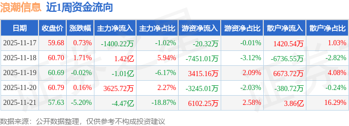 资金流向数据方面,本周浪潮信息主力资金合计净流出3.83亿元,游资资金合计净流出1198.93万元,散户资金合计净流入3.95亿元。本周资金流向一览见下表: