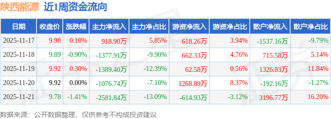 资金流向数据方面,本周陕西能源主力资金合计净流出5506.99万元,游资资金合计净流入1997.13万元,散户资金合计净流入3509.85万元。本周资金流向一览见下表: