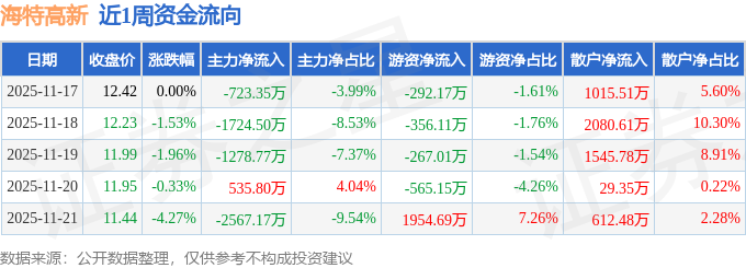 资金流向数据方面,本周海特高新主力资金合计净流出5757.97万元,游资资金合计净流入474.25万元,散户资金合计净流入5283.72万元。本周资金流向一览见下表: