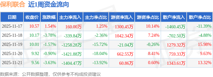 资金流向数据方面,本周保利联合主力资金合计净流出4264.46万元,游资资金合计净流入3045.15万元,散户资金合计净流入1219.31万元。本周资金流向一览见下表: