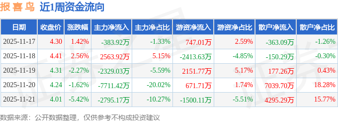 资金流向数据方面,本周报 喜 鸟主力资金合计净流出1.07亿元,游资资金合计净流出343.24万元,散户资金合计净流入1.1亿元。本周资金流向一览见下表: