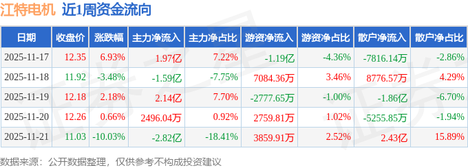 资金流向数据方面,本周江特电机主力资金合计净流出418.51万元,游资资金合计净流出986.19万元,散户资金合计净流入1404.7万元。本周资金流向一览见下表:
