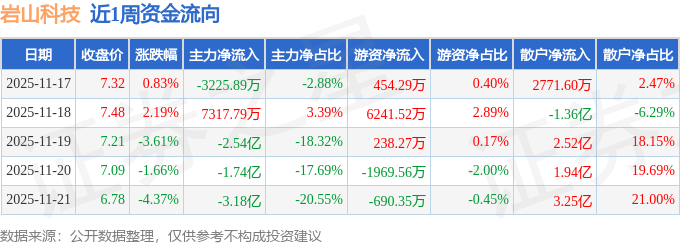 资金流向数据方面,本周岩山科技主力资金合计净流出7.06亿元,游资资金合计净流入4274.16万元,散户资金合计净流入6.63亿元。本周资金流向一览见下表: