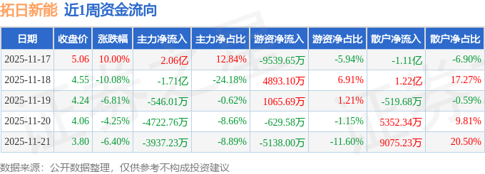 资金流向数据方面,本周拓日新能主力资金合计净流出5699.26万元,游资资金合计净流出9348.43万元,散户资金合计净流入1.5亿元。本周资金流向一览见下表: