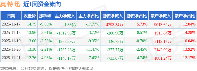 资金流向数据方面,本周奥 特 迅主力资金合计净流出1.95亿元,游资资金合计净流入2834.82万元,散户资金合计净流入1.67亿元。本周资金流向一览见下表: