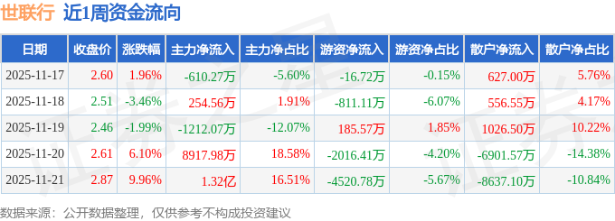 资金流向数据方面,本周世联行主力资金合计净流入2.05亿元,游资资金合计净流出7179.46万元,散户资金合计净流出1.33亿元。本周资金流向一览见下表: