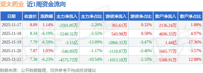 资金流向数据方面,本周亚太药业主力资金合计净流出2.44亿元,游资资金合计净流出4088.81万元,散户资金合计净流入2.84亿元。本周资金流向一览见下表: