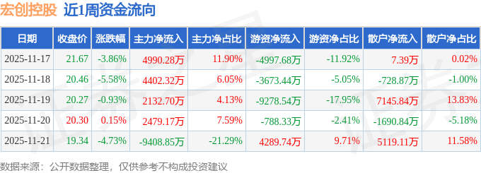 资金流向数据方面,本周宏创控股主力资金合计净流入4595.62万元,游资资金合计净流出1.44亿元,散户资金合计净流入9852.63万元。本周资金流向一览见下表: