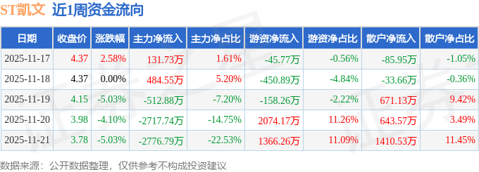资金流向数据方面,本周ST凯文主力资金合计净流出5391.12万元,游资资金合计净流入2785.51万元,散户资金合计净流入2605.62万元。本周资金流向一览见下表: