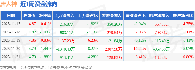 资金流向数据方面,本周唐人神主力资金合计净流出2316.45万元,游资资金合计净流入2944.27万元,散户资金合计净流出627.82万元。本周资金流向一览见下表: