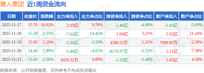 资金流向数据方面,本周雪人集团主力资金合计净流出6.71亿元,游资资金合计净流出1.32亿元,散户资金合计净流入8.03亿元。本周资金流向一览见下表: