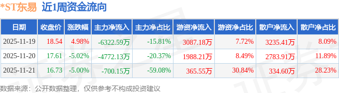 资金流向数据方面,本周*ST东易主力资金合计净流出1.18亿元,游资资金合计净流入5440.95万元,散户资金合计净流入6353.92万元。本周资金流向一览见下表: