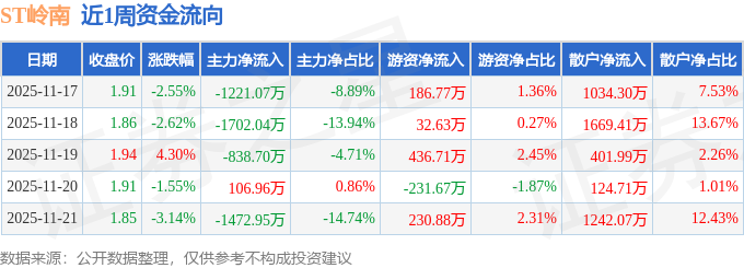 资金流向数据方面,本周ST岭南主力资金合计净流出5127.8万元,游资资金合计净流入655.33万元,散户资金合计净流入4472.47万元。本周资金流向一览见下表: