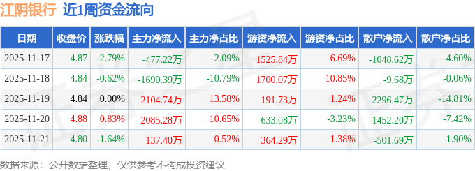 资金流向数据方面,本周江阴银行主力资金合计净流入2159.81万元,游资资金合计净流入3148.85万元,散户资金合计净流出5308.66万元。本周资金流向一览见下表: