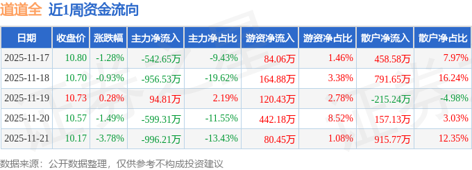 资金流向数据方面,本周道道全主力资金合计净流出2999.88万元,游资资金合计净流入892.0万元,散户资金合计净流入2107.88万元。本周资金流向一览见下表: