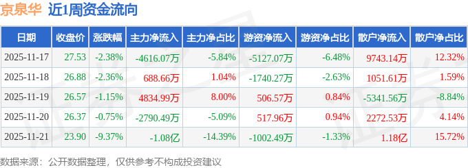 资金流向数据方面,本周京泉华主力资金合计净流出1.27亿元,游资资金合计净流出6845.3万元,散户资金合计净流入1.96亿元。本周资金流向一览见下表: