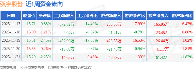 资金流向数据方面,本周弘宇股份主力资金合计净流出832.6万元,游资资金合计净流入637.0万元,散户资金合计净流入195.6万元。本周资金流向一览见下表: