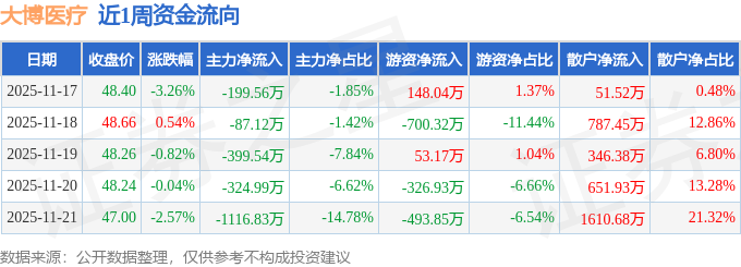 资金流向数据方面,本周大博医疗主力资金合计净流出2128.05万元,游资资金合计净流出1319.9万元,散户资金合计净流入3447.95万元。本周资金流向一览见下表:
