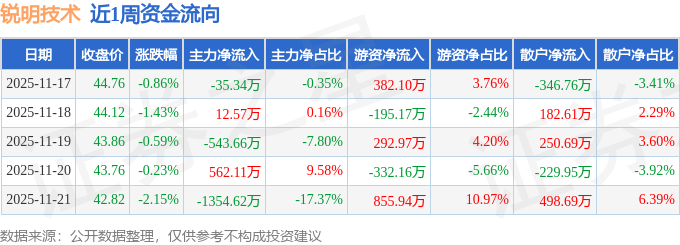 资金流向数据方面,本周锐明技术主力资金合计净流出1358.94万元,游资资金合计净流入1003.67万元,散户资金合计净流入355.27万元。本周资金流向一览见下表: