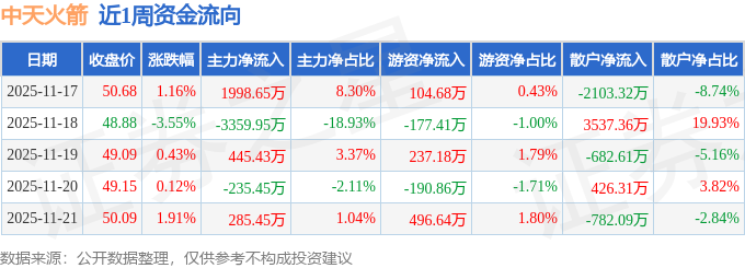 资金流向数据方面,本周中天火箭主力资金合计净流出865.87万元,游资资金合计净流入470.22万元,散户资金合计净流入395.65万元。本周资金流向一览见下表: