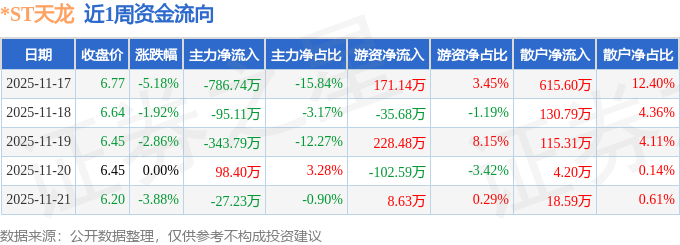 资金流向数据方面,本周*ST天龙主力资金合计净流出1154.46万元,游资资金合计净流入269.98万元,散户资金合计净流入884.48万元。本周资金流向一览见下表: