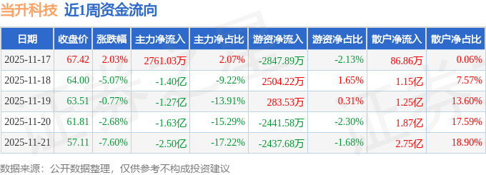 资金流向数据方面,本周当升科技主力资金合计净流出6.53亿元,游资资金合计净流出4939.41万元,散户资金合计净流入7.02亿元。本周资金流向一览见下表: