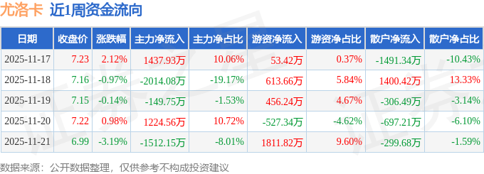 资金流向数据方面,本周尤洛卡主力资金合计净流出1013.5万元,游资资金合计净流入2407.8万元,散户资金合计净流出1394.3万元。本周资金流向一览见下表: