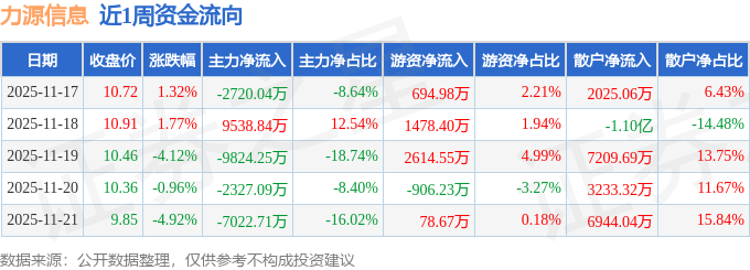 资金流向数据方面,本周力源信息主力资金合计净流出1.24亿元,游资资金合计净流入3960.37万元,散户资金合计净流入8394.87万元。本周资金流向一览见下表: