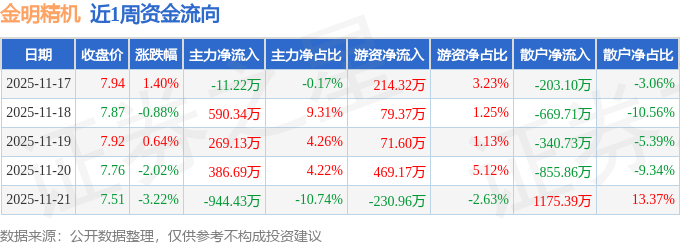 资金流向数据方面,本周金明精机主力资金合计净流入290.51万元,游资资金合计净流入603.5万元,散户资金合计净流出894.01万元。本周资金流向一览见下表: